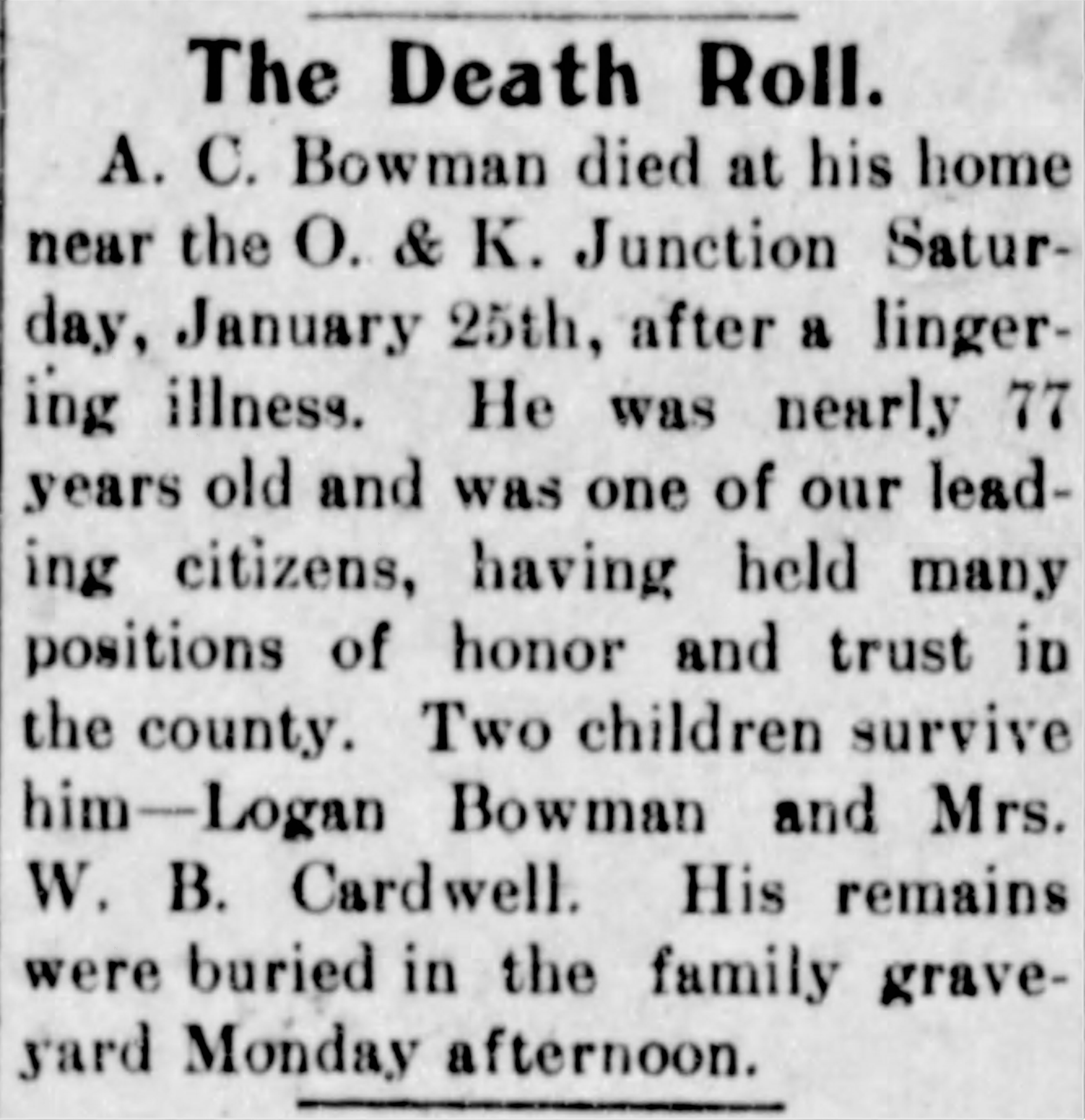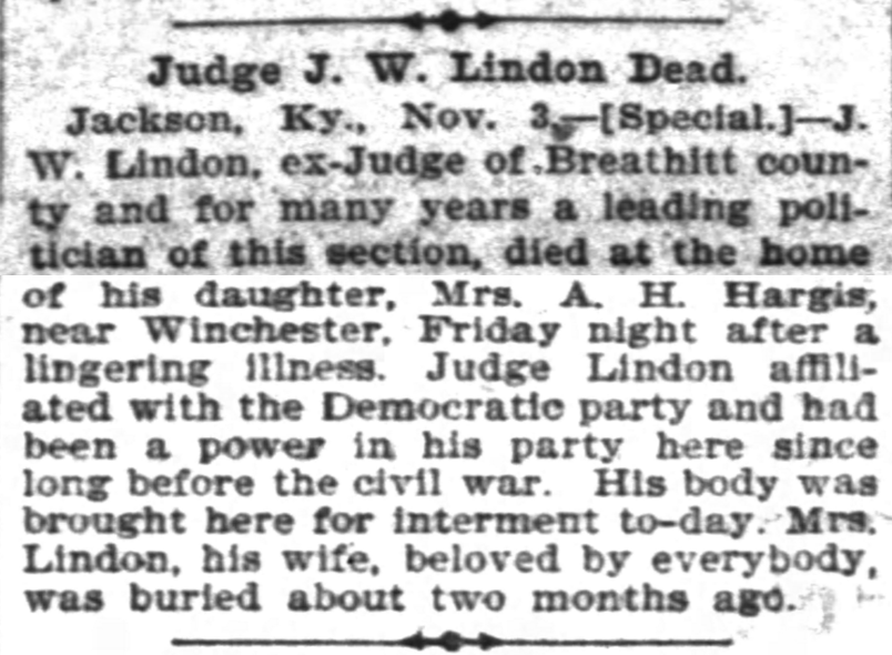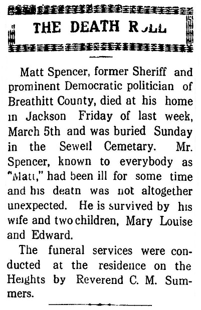 Died on May 21, 1913 in Jackson, Breathitt County, Kentucky