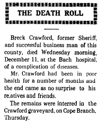 Buried on December 16, 1877 in the Crockettsville Cemetery, Crocketsvile, Breathitt County, Kentucky