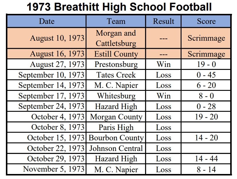 Gray announced in The Jackson Times in early August that he had completed the 1973 schedule, which included thirteen games with junior varsity squads across the area, including one scrimmage. He noted that they would be playing only junior varsity squads or “B Teams” for the first year to gain experience. The coach also announced that all the games were scheduled to be “away games” because Breathitt did not have a certified field while he was making the schedule.