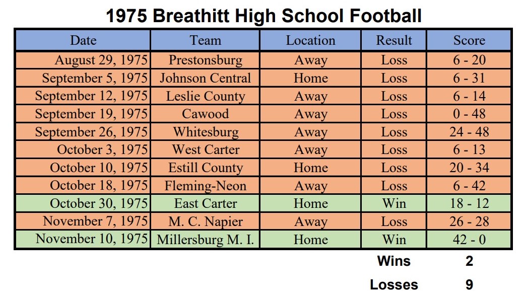On October 30, 1975, Breathitt took on East Carter at a make-shift field at the Jackson National Guard Armory. Hilton had contacted the KHSAA and asked to play on a modified field. “we could only get an 80-yard field with the room we had over there,” Hilton said in 2023. “So they gave us permission to play our home games on a shorter field if the other team agreed until the stadium was ready.” Breathitt claimed an 18-12 victory. A smiling Hilton said he was “very pleased with our boy’s play.”