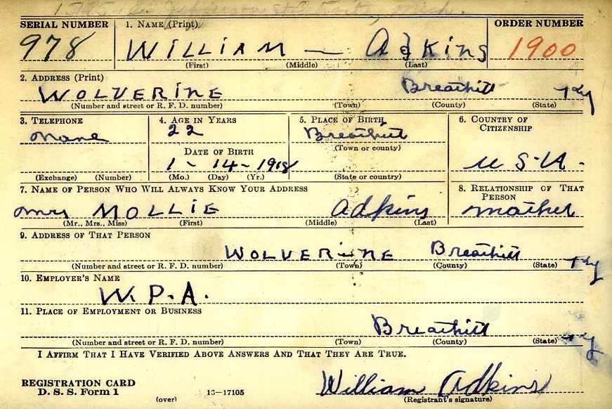 When the German army invaded Poland in 1939 and after the Japanese bombing of Pearl Harbor in 1941, William Woodrow Adkins registered for the draft on October 16, 1940, as required. Bruce Cundiff, the Draft Registrar for the Wolverine Precinct, described Adkins as a white male, about five feet and five inches tall. Cundiff reported that Adkins had gray eyes, brown hair and was of a “light complexion.” He did note a scar on the left side of Adkins’ head from a previous injury. At the time of his registration, Adkins, then 22, worked on a Works Progress Administration job in Breathtit County, building roads and culverts as part of the local New Deal effort.