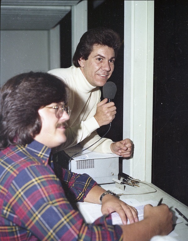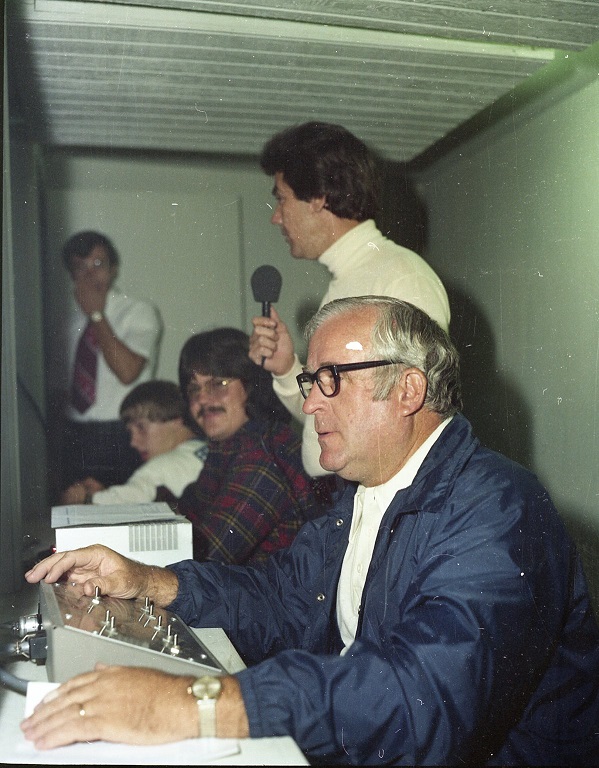 Broadcasting the game are Jim Maggard and Jerry Little. Sam Herald kept score. Athletic Director Ted Edmonds stands at the door of the broadcast booth.
