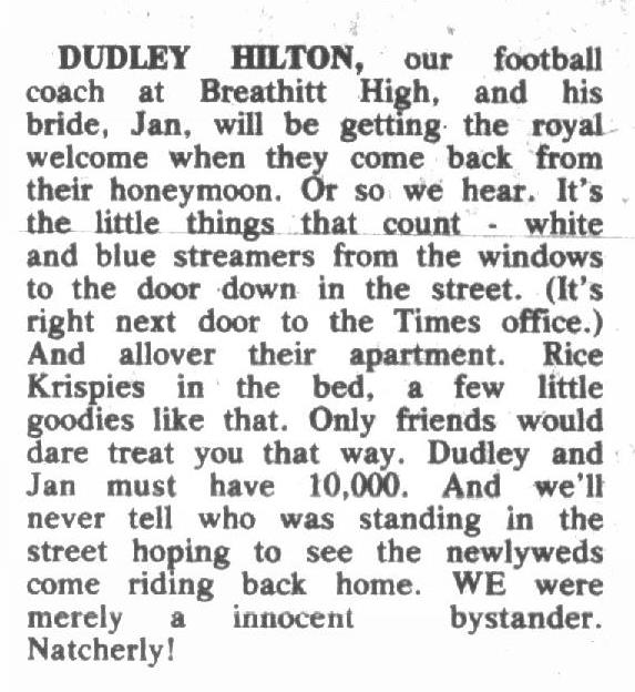 On July 21, 1977, Louise Hatmaker devoted a paragraph in her Poupourri Article to the antics perpetrated by the Hilton’s “friends” who made their way into their apartment while they were on their honeymoon.