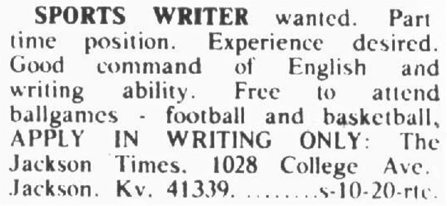 The ad was printed in the newspaper for several weeks, but few experienced writers were willing to work for the offered salary. 1977 turned into 1978, and the team worked in the weight room while The Jackson Times waited for someone to write about their efforts in the coming year.