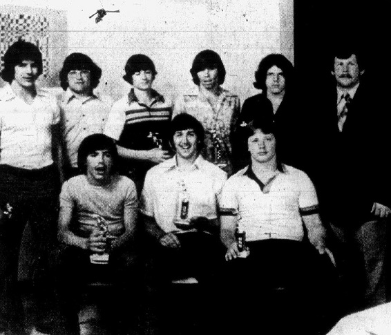 Hilton handed out 11 awards at the 1977-1978 All-Sports banquet. From Row: Darrell King. William Shepherd. Paul Collins. Back row: Danny Back. Barry Sams. David Napier. John Riggs, and Ricky Holbrook, and Coach Dudley Hilton.