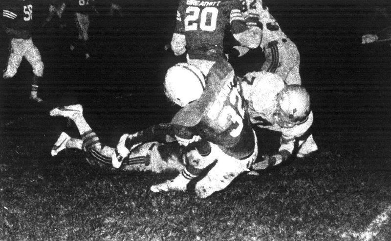 Glen Patrick, playing with an injury, carried the ball 12 times for 63 yards. Glen could have had a very good night had he not had this nagging injury.