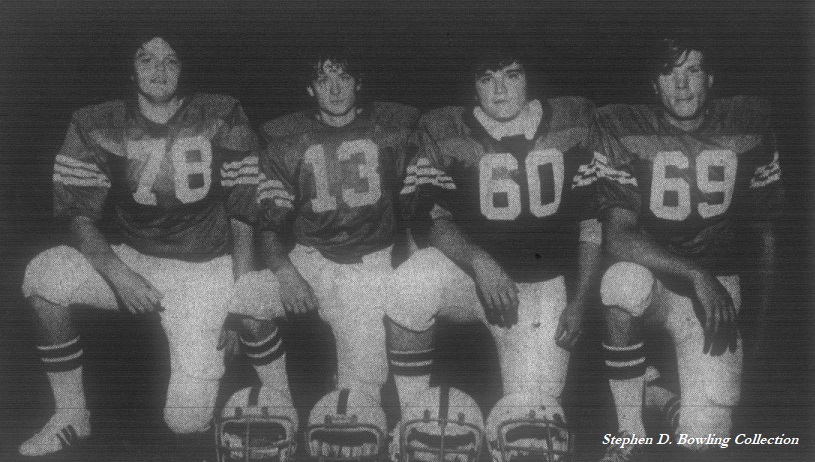 Breathitt’s four Seniors played their last game at Breathitt High School on October 28, 1977. Coach Dudley Hilton gave his Seniors credit for “providing the leadership that’s helped Breathitt County to its 7-4 and a shot at the district championship.” The Seniors were: (left to right) Dwayne Hay, David Napier, Barry Sams, and Mark Trent.