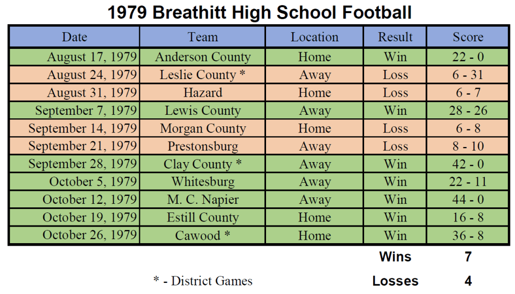 1979 ended not like the coaches and team wanted. They won seven of their eleven games and closed the year on a five-game winning streak. The team graduated eight seniors who were some of the first veterans of the Hilton system. Work finally got rolling on the new locker room expansion in late 1979. Breathitt football was once again on the move, but the players were not happy to have missed the playoffs.