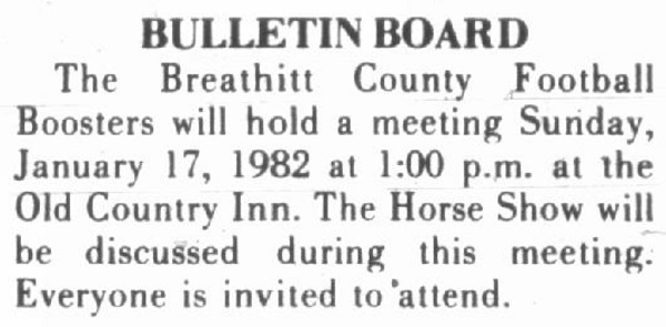 Expectations were high for the 1982 season, and many in the community saw “big things” ahead from a promising group of upperclassmen. Bill Toler told the Breathitt County School Board in July 1982 that he was “very optimistic.” “We have pumped a lot of money into our football program,” he said. “We’ve had to nurse it.” He smiled during his athletics report as he told the board, “I can stand here and tell you in all sincerity that this year the football program will take care its itself,” he said. “Unless I miss my guess, we’re going to have the best football program ever.”