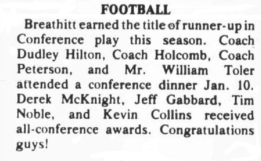 Officials recently met to select the All-conference team. Four Breathitt Bobcats were selected to that team. Kevin Collins was selected to linebacker position. Tim Noble, defensive guard; Derek McKnight, defensive end, and Jeff Gabbard, fullback.