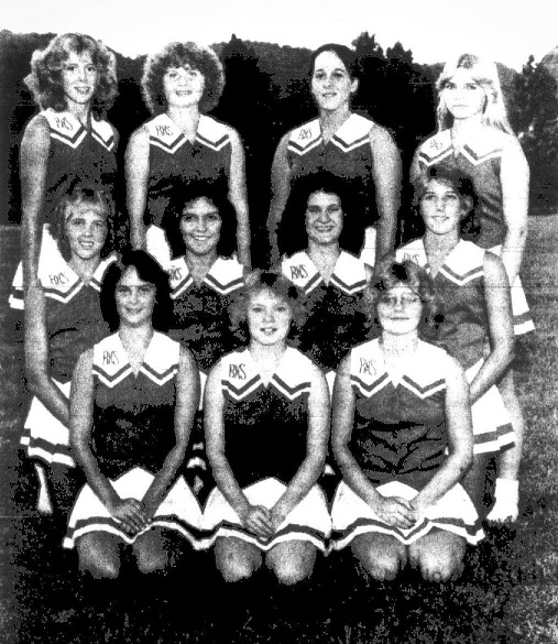 THE BHS CHEERLEADERS are (up front) Tammy Carpenter, Ellen Shackleford, and Susan Clemons. 2nd row: Cheri Ison, Deana Marshall, Peggy Turner, and Lisa McGees. Back row: Renee Clair, Wanda Ritchie, Kim Little, and Vicki Brown.