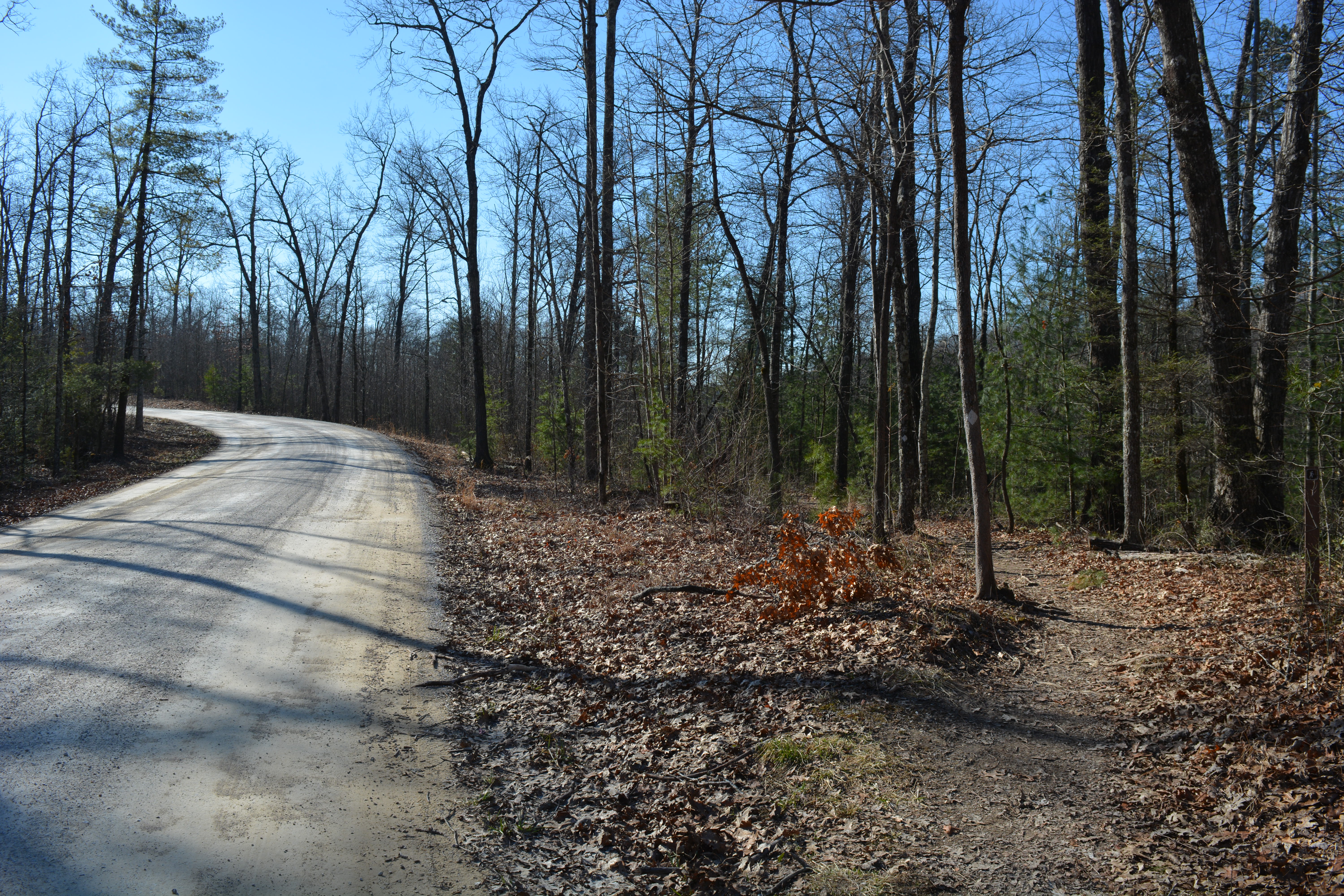 Corner Ridge Road runs .96 miles from Highway 77 to the Corner Ridge Trail Head, located on the edge of the Clifty Wilderness. The large, flat area in the woods to the right of the trail, about fifty yards beyond the stones, will serve as our camp for Hike Three after you have completed about 17 (or so) miles on Saturday.