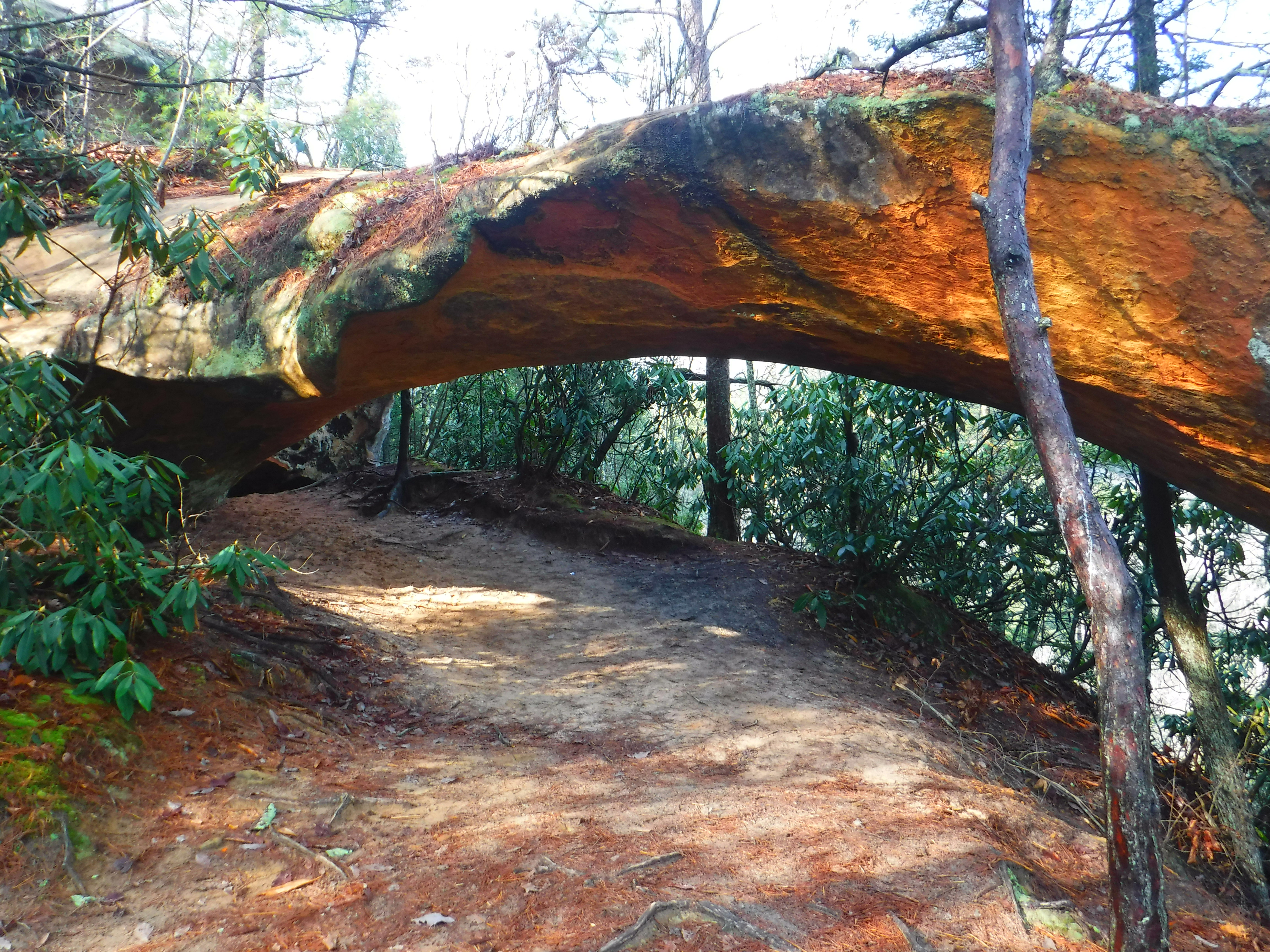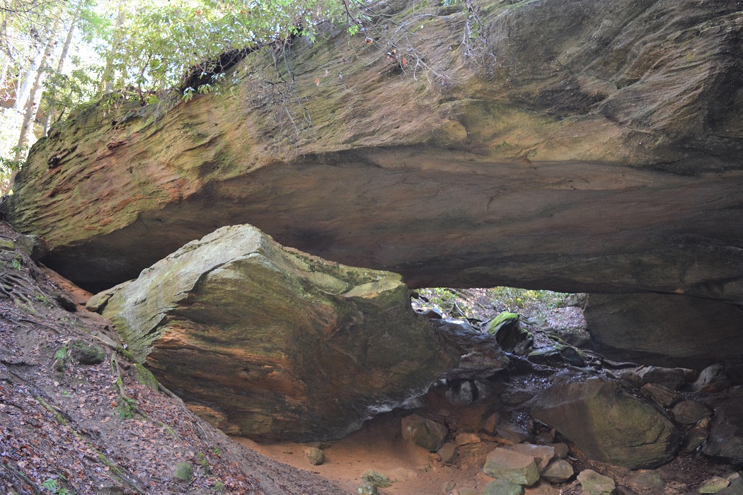 Of the hundreds of arches that the Sheltowee Trace National Recreation Trail passes, Indian Arch is the closest to the trail. This large, orange and red, sandstone arch is a buttress-type arch that extends from the rock above over the hill to the cliff line below. Indian Arch is approximately 60 feet long and has an opening at the top of the stairs of nearly 30.