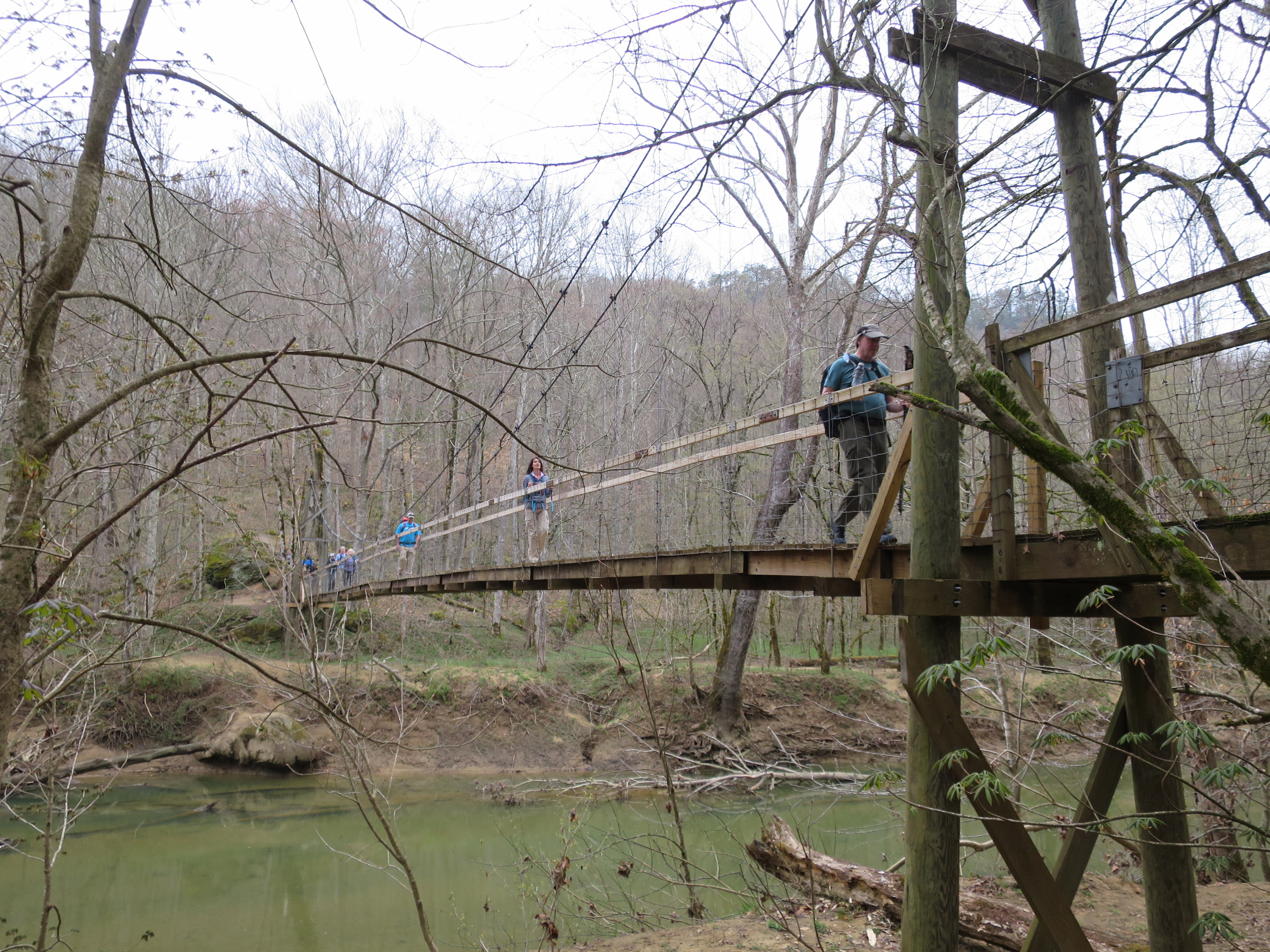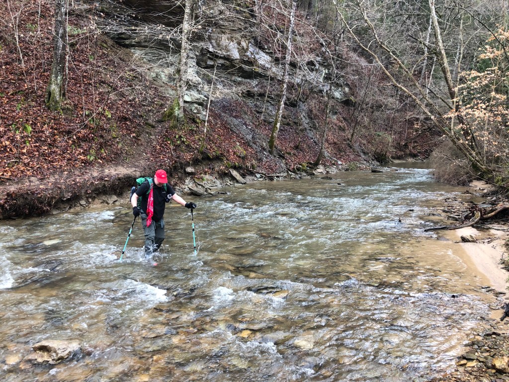 The Sheltowee Trace crosses the Red River on a 100-plus foot suspension bridge after crossing Highway 715. The bridge, 9.94 miles into our Sunday walk, is the only means of crossing the Red River with dry feet for more than 5 miles in each direction. Several large trees brought down the bridge in 2022, and work is continuing to repair the crossing. For us, however, it will be a shallow creek wade to get to the other side of the Red River and Highway 715 beyond.