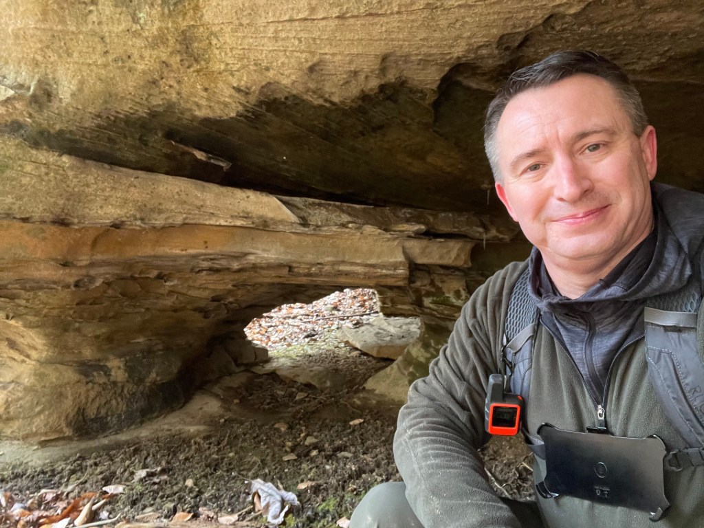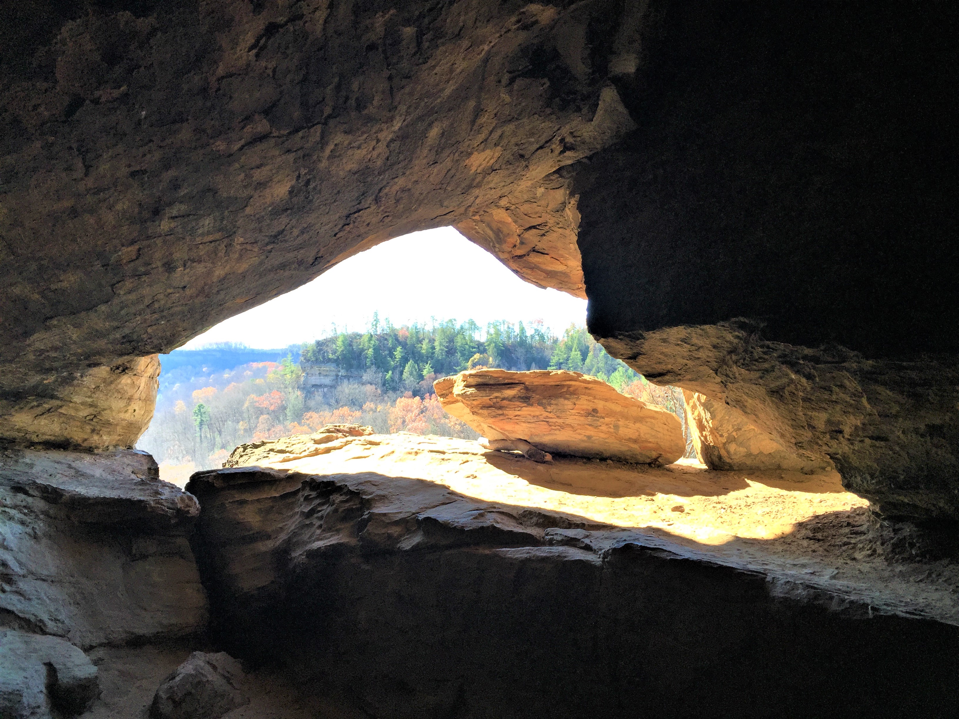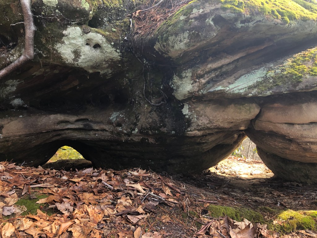 The Sheltowee Trace makes a sharp right turn as you make your way down the point after leaving Indian Arch. A user-created trail leaves the Trace to the left and circles around behind a rock where the Sheltowee Trace Twin Windows can be found.