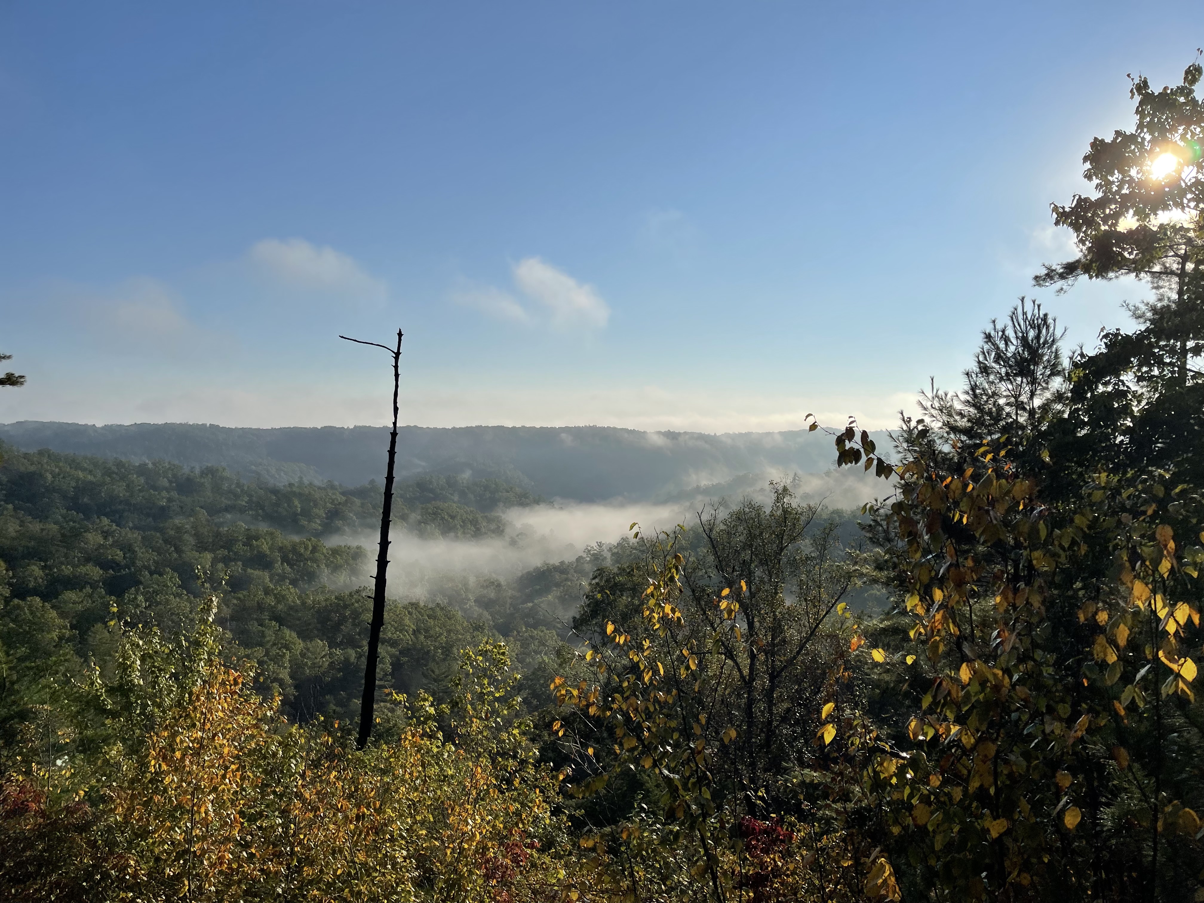 Tunnel Ridge Road (FS 39) is the only connection between the trails in the Grays Arch area and the Auxier Ridge area at the end of the 3.58-mile-long Tunnel Ridge Road. Numerous parking and hiking areas can be found along Tunnel Ridge Road, and two overlooks have been created. Cross Tunnel Ridge Road and continue on the Sheltowee to the Pinch ‘Em Tight Trailhead and a ride to your car.