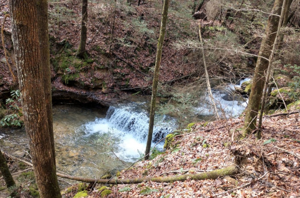 The Sheltowee Trace heads north to Peters Mountain Trailhead up Mark Branch. A short 1.42-mile walk up the trail brings the hiker to a steep set of steps with the sounds of falling water in the background. To the right of the trail is Mark Branch Falls.
