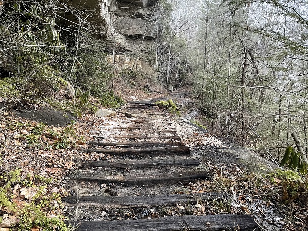After descending into Massey Branch, the Sheltowee Trace follows the steep bed of a coal railroad bed as the old path makes its way down the hill. Near the head of the creek, a section of the trail has washed away the topsoil and exposed a section of old railroad ties. These wooden ties once held the steel tracks upon which the rails ran as the removed resources, including timber and coal, from this area. All that remains to verify that a large-scale operation once existed here are these wooden remains. Be careful- the algae, mud, and rotten wood make these wooden sidewalks very slick.