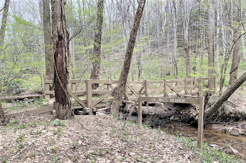 Along the banks of the Big South Fork, the Sheltowee Trace crosses a bridge at the mouth of Oil Well Branch. This two-and-a-half-mile creek has six branches and was the site of one of the first drilled oil wells in McCreary County. A small forest service sign near the creek marks the location of this now defunct well, but the name given to this creek by locals still sticks.