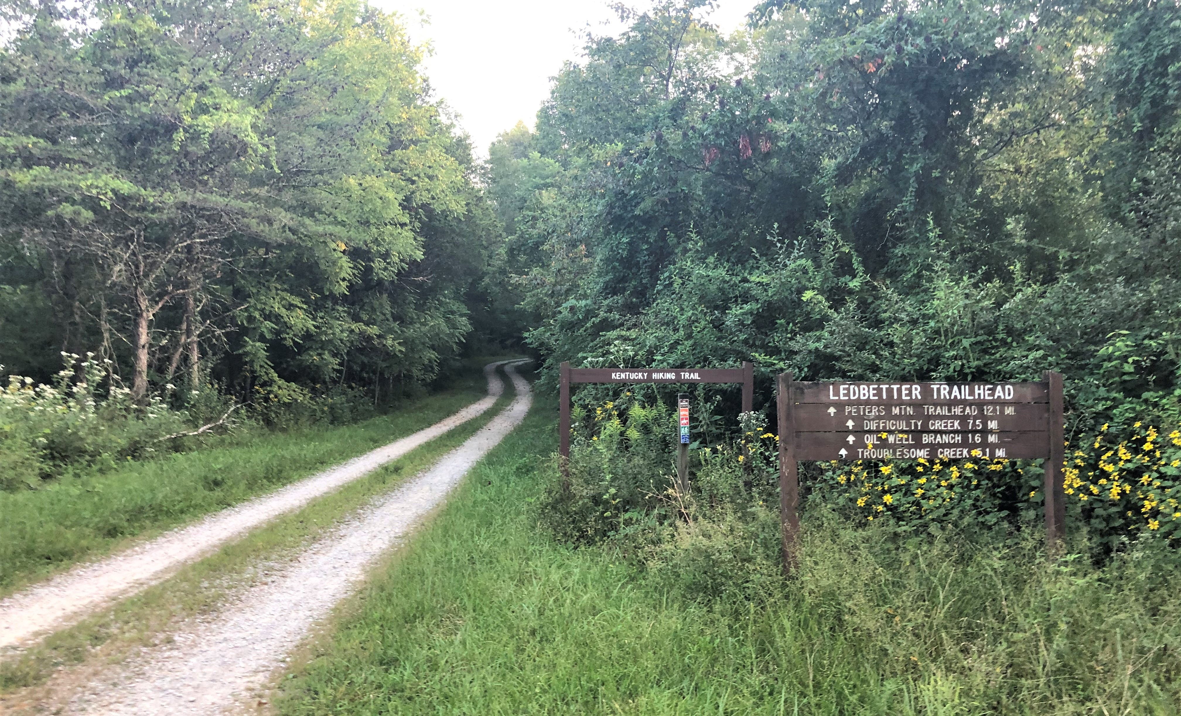 Located at the intersection of the Sheltowee Trace and the Bald Knob-Hill Cemetery Trail, the Ledbetter Trailhead is approximately 12.1 miles from Peter’s Mountain. The trailhead offers parking for ten vehicles and is often a camping spot for hikers. This trail access point is available via a maintained gravel roadway and is easily reached throughout the year. Occasionally, there is some trail magic at this location, but do not count on it.