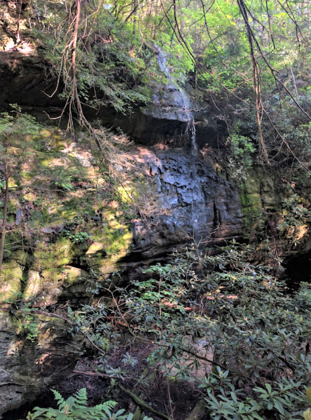 This 63-foot-tall natural wonder is about three feet wide during normal flow. This plunge falls formed from the erosion of a thick layer of coal and Salvy Creek shale, which left a high ledge of grundy sandstone. The Falls is a popular hiking destination due to its proximity to the Peters Mountain Trailhead. Enjoy this picturesque spot because there is still more climb to get out of Mark Branch.