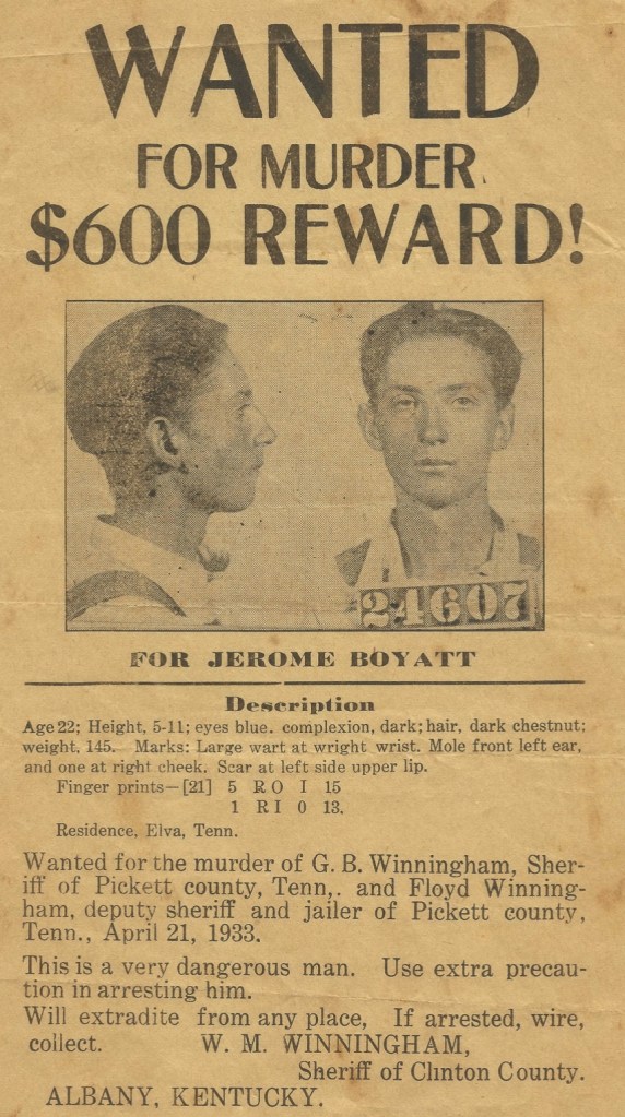 They located the suspects in a railroad car and approached the door. Jerome Boyatt fired his .45 caliber pistol at the lawmen killing Deputy Sheriff John Floyd Winningham instantly and fatally wounding Pickett County Sheriff George Winningham, who died the next day.