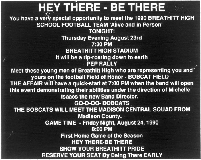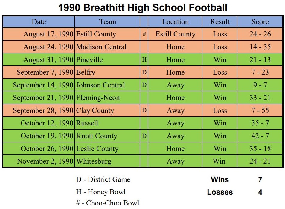 After the success of the 1989 season, hung like a shadow over the 1990 season. Everyone expected similar results as the previous year but failed to take into account the loss of a large portion of the defense and most of the offense. Expectations early in the year were just too high for a young team. While the community support continued and grew in some areas, the 1990 team quietly went to work to continue the “Pride” they had for Breathitt football.