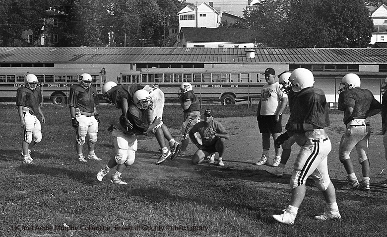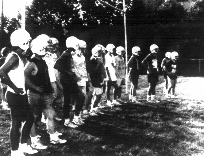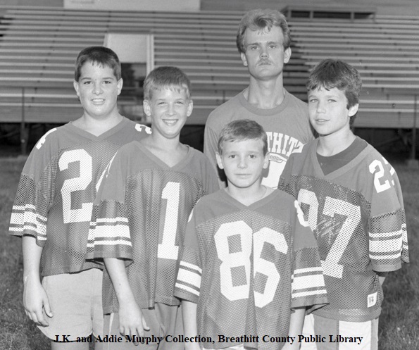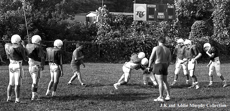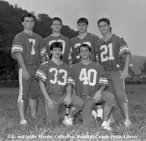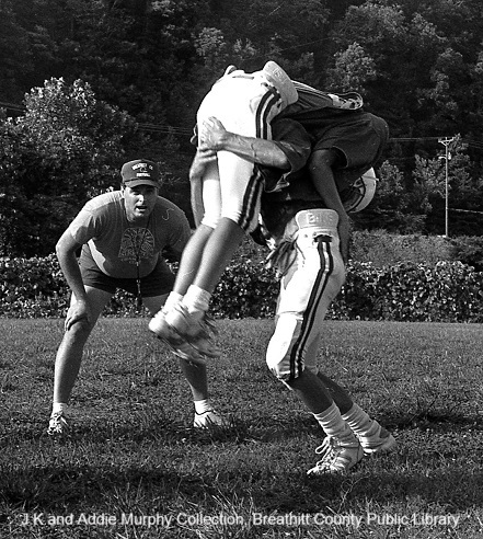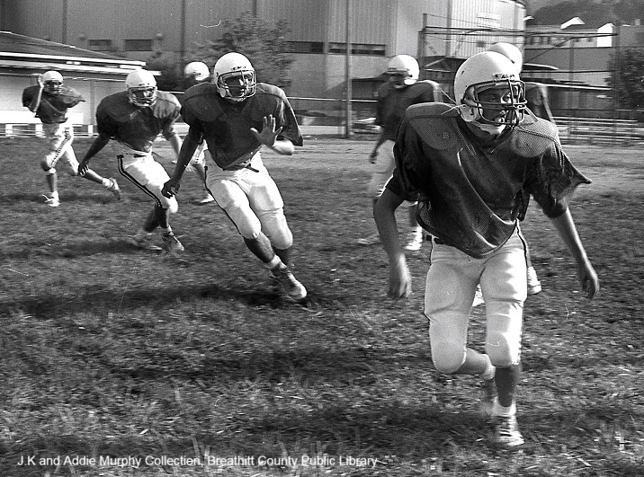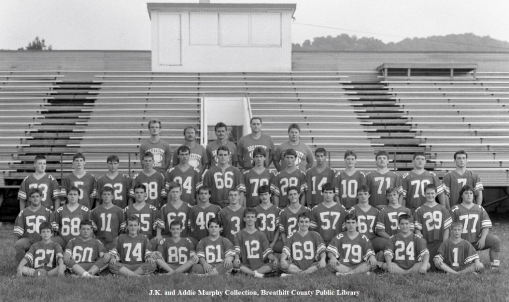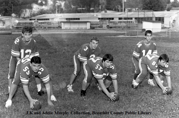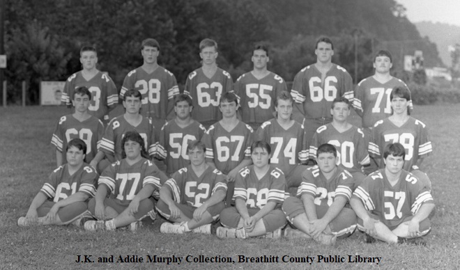 The District Championship of the season brought many honors and pure delight to the Bobcat fans. Unlike most uniforms used in high school sports, the use of safe, well-built clothing and battle gear is on the high side, and of course, with over forty young men involved in the sport at Breathitt High compared to basketball, baseball, and track sports during a school year. Washing machines also saw a lot of service at the homes of the players.