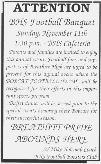Don’t forget the time and place: 1:30 p.m. on Sunday, November 11, at Breathitt High School’s dining room. Buffet dinner, courtesy of all involved in the football team. Our Bobcats- they belong to all of us, and we enjoy their success and regret a loss. We are all a part of a winning tradition. Come celebrate with us.