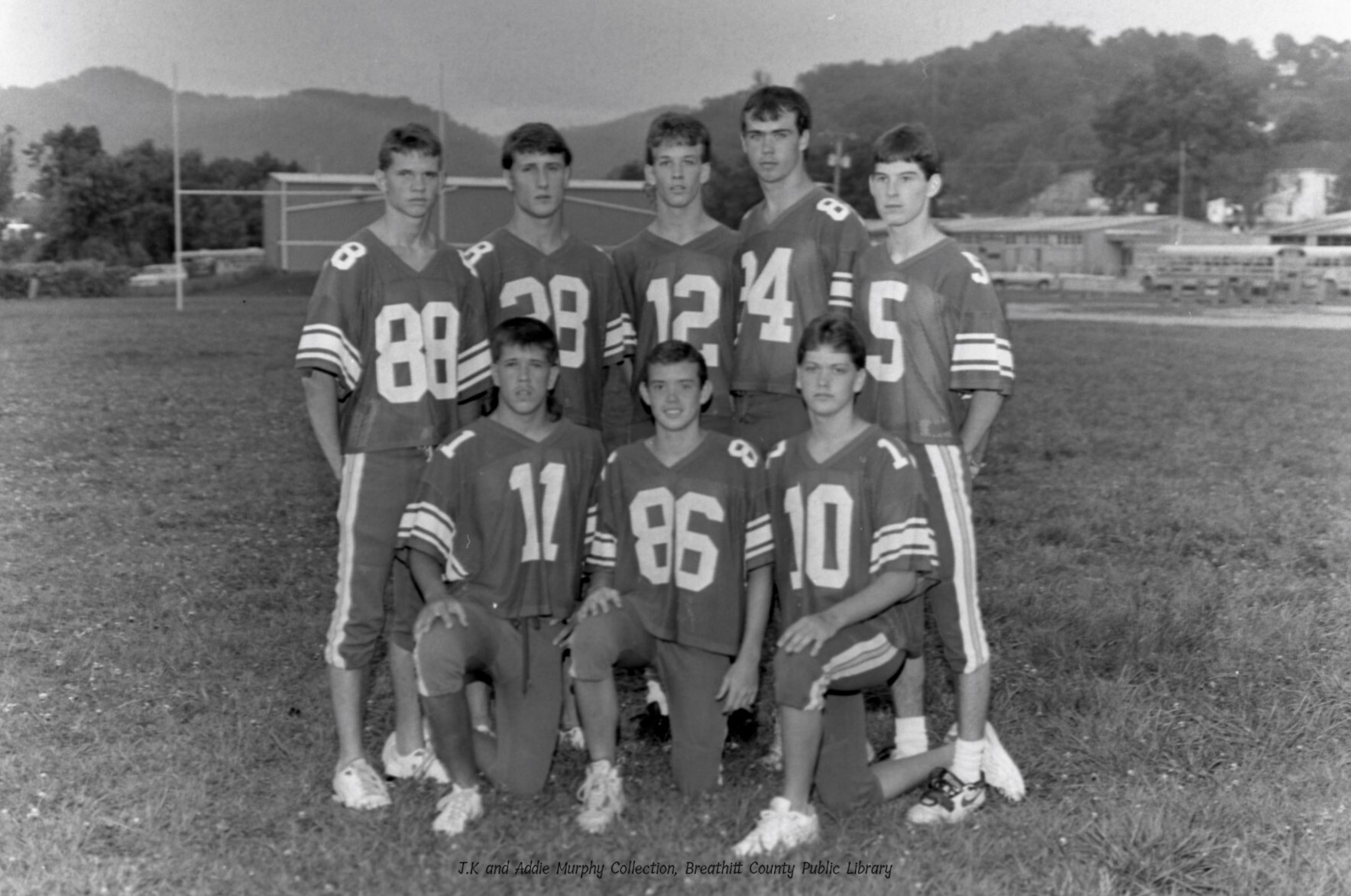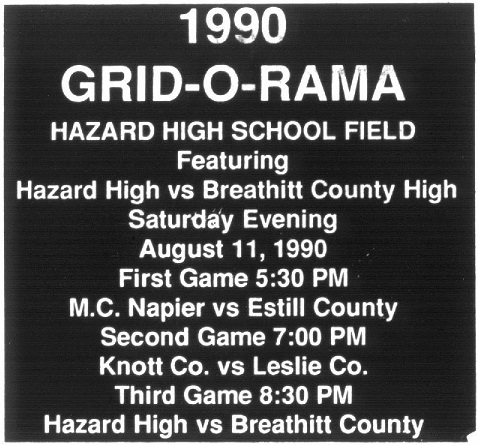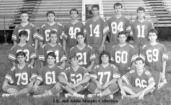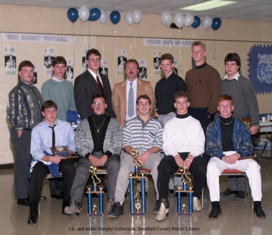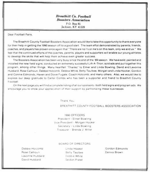 He expressed appreciation to the school staff and faculty, from the office, Board of Education, bus drivers, Superintendent, both banks, Kiwanis Club, Quality Home Supply, Jackson Times, Wal-Mart, True Value, State and local police, ambulance service, fire Department, Dr. Cornett, J.K. and Addie Murphy, WEKG, Jeff Gabbard, Sam Herald, Hubert Herald, Coach JamesTurner, Boosters Club, Ron Harmon, and especially the parents. He expressed special appreciation to the band, cheerleaders, pep club, ROTC, and student council for their support of the 1990 football program.