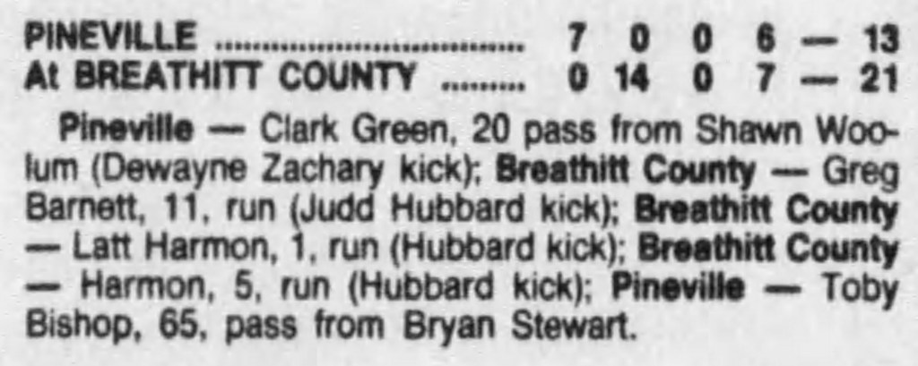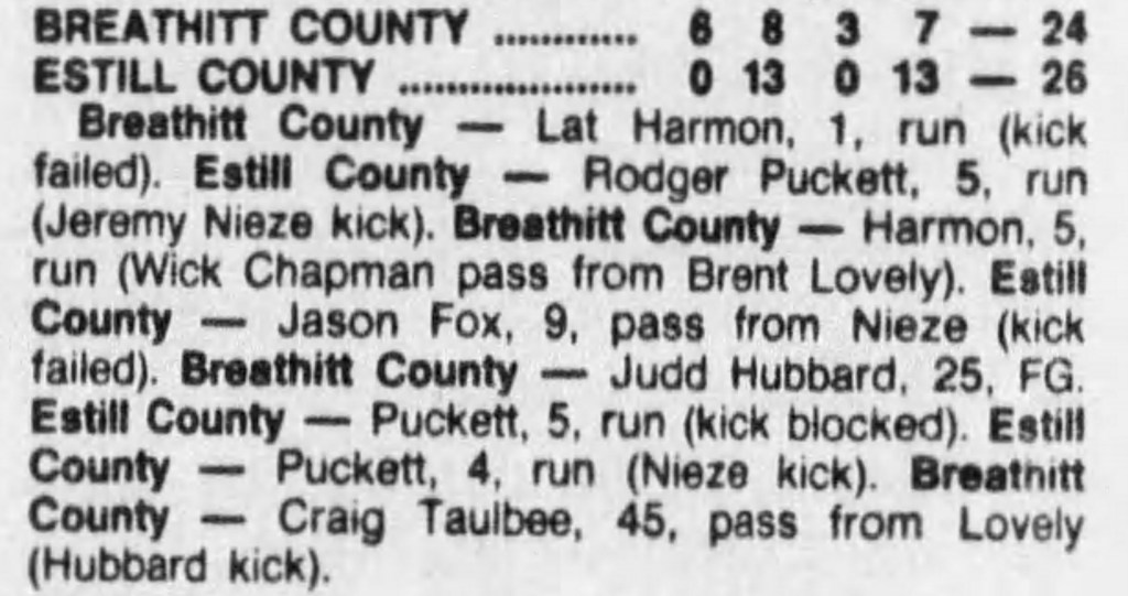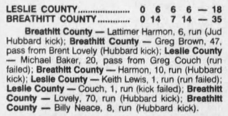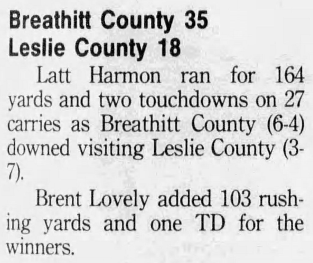 Judd Hubbard was on the first-team offense, and Brent Lovely third-team defense. This is the second time in the history of football at Breathitt High that the school had a player to make the first team. Rich McCune did it in 1987.