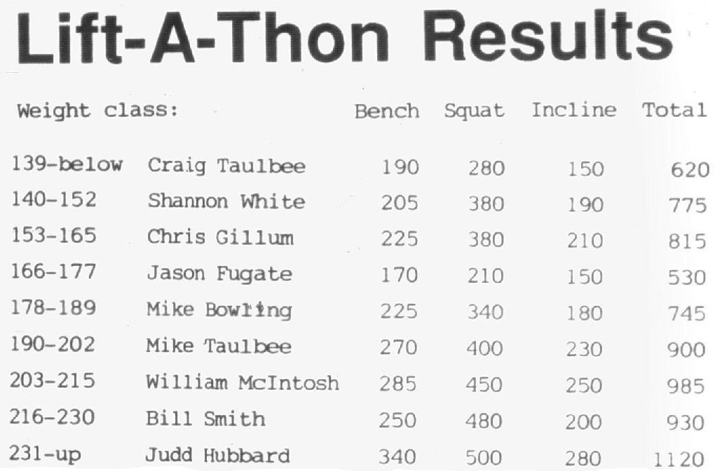 He added that he especially wanted to thank Wal-Mart for the use of their facility. Appreciation was also expressed to the First National Bank for the tee shirts. It takes considerable help to put on an event as big as the lift-a-thon. Holcomb said he wanted all of those who helped in any way to realize that their services were much appreciated.