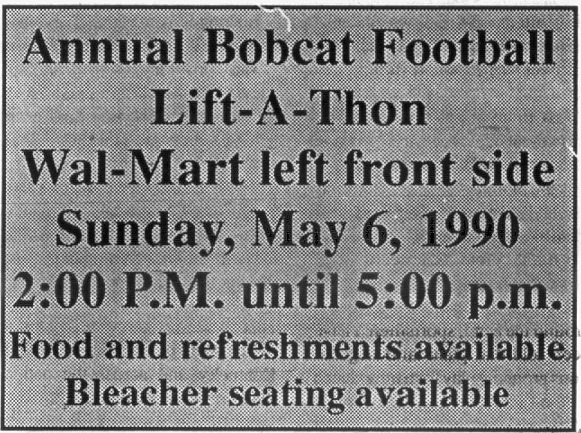 The date for this annual Lift-A-Thon will be Saturday, May 5th. The starting time has not been established but is expected to be near the noon hour. The exact starting time will be announced when it is firmed up, according to Coach Holcomb and Terry Hall, Manager of Wal-Mart.