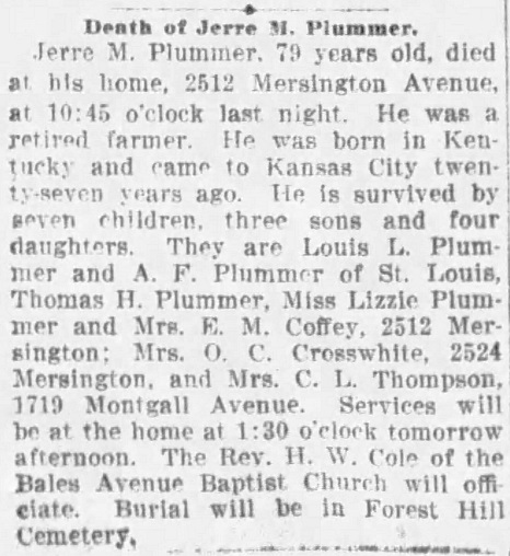 Buried on January 14, 1912, in Block 16 of the Forest Hill Cemetery in Kansas City, Jackson County, Missouri.