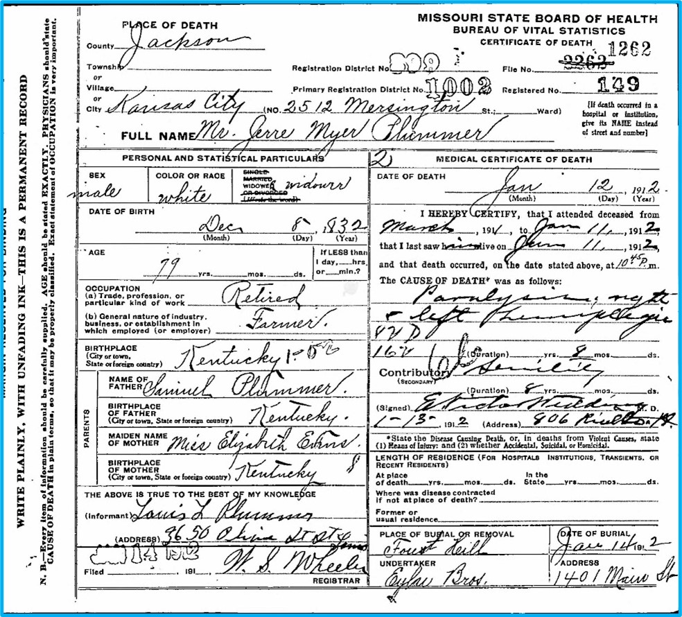 Died at 10:45 p.m. on January 12, 1912, at 2512 Mersington Avenue in Kansas City, Jackson County, Missouri.