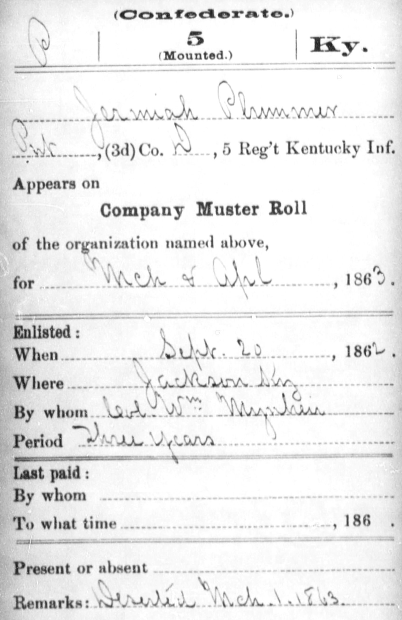 Enlisted: 1862, September 20 at Jackson, Breathitt County, Kentucky by Acting Colonel William H. Mynhier for aperiod of three years.
