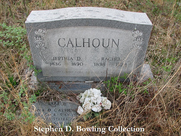 Rachel remained at home and cared for her aged parents. Later in life, a 35-year-old Rachel married 37-year-old Jeptha D. Calhoun of Breathitt County in 1873. The couple settled near his father on ancestral lands downstream from Hunting Creek at the mouth of Calhoun Branch. Together they had three known children. A daughter, Mary, was born on January 13, 1874, and died the next day. Two sons, Jacob Sandusky Calhoun, and Henry Clay Calhoun, would follow in 1876 and 1878 before time and normal biological cycles prevented additional children.