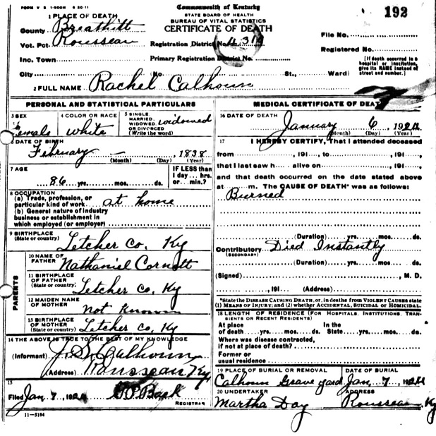She was buried on Monday morning, January 7, 1924, beside her husband, Jeptha D. Calhoun, in the family cemetery opposite the mouth of Calhoun Branch at Rousseau. A marble tombstone was ordered by her sons and placed on her grave. Many years later, a double granite stone was ordered for Jeptha and Rachel and placed on their graves, replacing Rachel’s marble stone and Jeptha’s hand-carved marker.