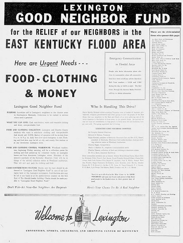 Civic leaders in Lexington started the Good Neighbor project to help serve the people of the state and to meet their needs after the flooding. Hundreds of lads of food and supplies were distributed across the state and in Breathitt County from Lexington’s efforts.