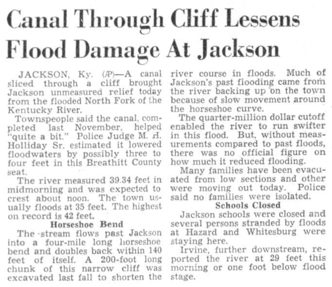 The first major test of the recently completed Jackson Cut-Off Flood Control Project proved highly favorable, as experienced river observers were unanimous in their opinion that had it not been for the Cut-Off, Jackson and Breathitt counties would have experienced the most disastrous flood in history.