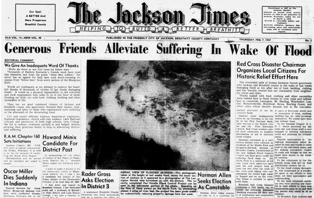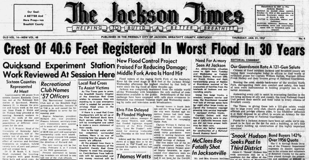 The Jackson Times published a small edition on January 31, 1957 (only 6 pages) but was unable to distribute the prints to many areas in the county. The headline of the paper reported the 40-foot water level and the dire situation many in the mountains found with access to limited supplies such as food and electricity. By the time the newspaper hit the stands the following day, some access by road had been restored.