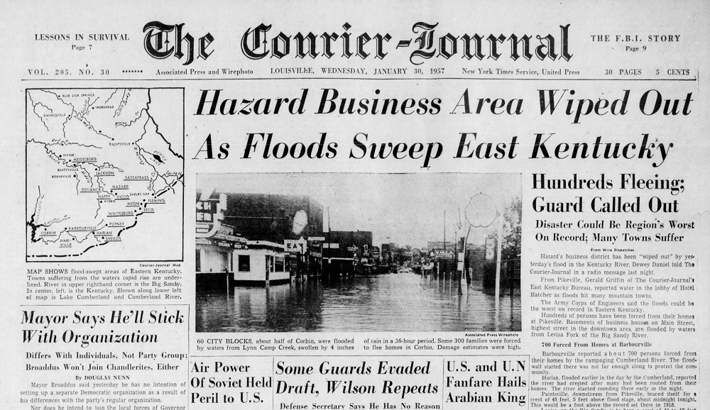 Some of the destruction at Hazard was detailed on the front page of The Louisville Courier-Journal on January 30, 1957. The newspaper also provided details of other flooded communities in the state.