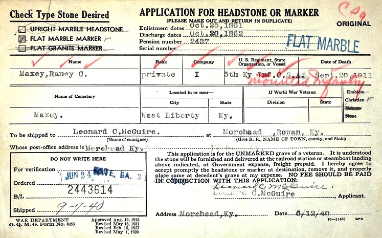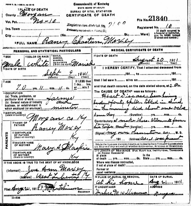 Buried on August 21, 1911, in the Maxey-Ford Cemetery, Morgan County, Kentucky.