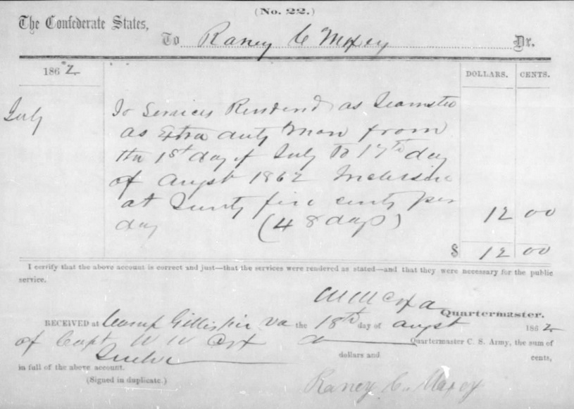 Paid- 1861, December 31 by R. Hawes, 1862, June 30 by Major Crutchfield, 1862, and September 20 by Major Fisher.