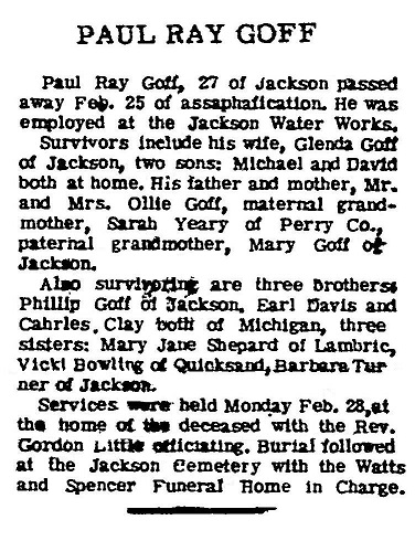 Funeral services for twenty-seven-year-old Paul Ray Goff were held on February 28 at the Goff home in Jackson. His wife, Glenda, sat near the casket. He was survived by two sons, Davis and Michael, parents, Ollie and Violet (Yeary) Goff, two grandmothers, three brothers, and three sisters. Goff was buried in the Jackson Cemetery on Monday, February 28.