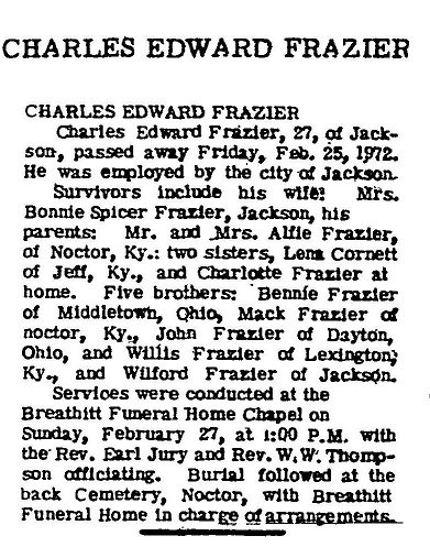 The hearse from Breathitt Funeral Home took the body of Charles Edward Frazier. His funeral was preached on February 27 by Rev. Earl Jury and Rev. W. W. Thompson. His widow, Bonnie (Spicer) Frazier, two sisters, and the five brothers mourned his death. He was buried in the Frazier Cemetery lot on Quicksand near the Lazarus Back Cemetery.