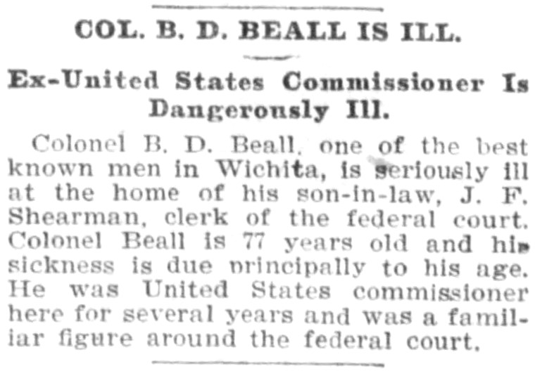 Death of Wife– Dora (Griffey) Beall died at her home in Wichita in Sedgwick County, Kansas. She was buried beside her husband in Section I, Lot 15, Grave 5, at the Maple Grove Cemetery at Wichita in Sedgwick County, Kansas.