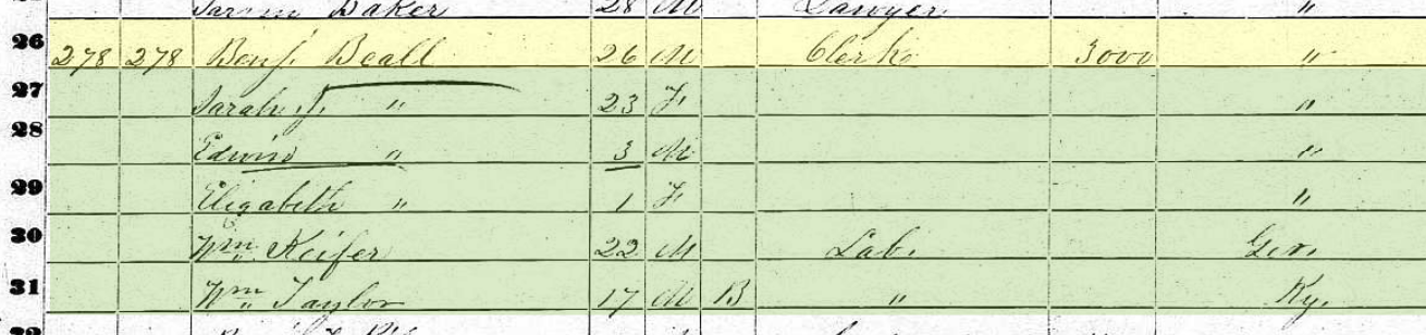 Death of Wife– Sarah Jane (Griffey) Beall died following childbirth on December 3, 1854, in Campbell County, Kentucky.
