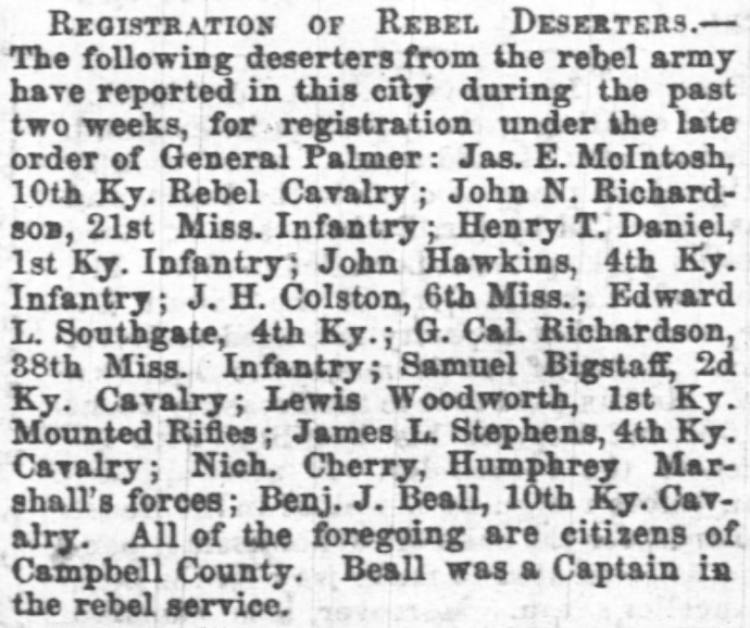 Listed as Deserted: 1864, January 20 at Johnson Ford in East Tennessee
