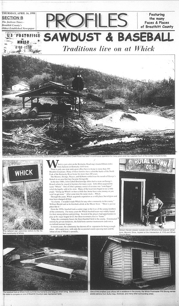 One of the first human interest articles I published appeared in print on April 16, 1998, and featured a short look at the community of Whick. The article, entitled Sawdust & Baseball: Traditions Live on at Whick, was written to be a look at the history of the logging industry in the area and the many generations of great baseball players from the area. When the article finally ran, it had to be shortened to make way for the annual list of delinquent taxpayers. The result was a much smaller article that attempted to highlight the small community on the banks of the North Fork of the Kentucky River. Sadly, the original written copy was most likely trashed. All that remains is the shortened version that made it into print.